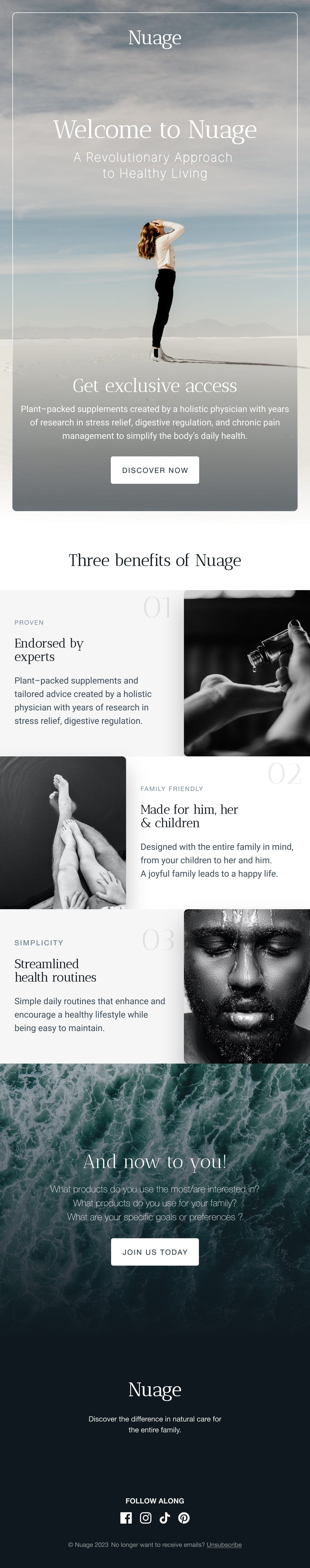 Three-email welcome series for a premium skincare brand, built to carry editorial quality into the inbox. Tested across 90+ render combinations before delivery.