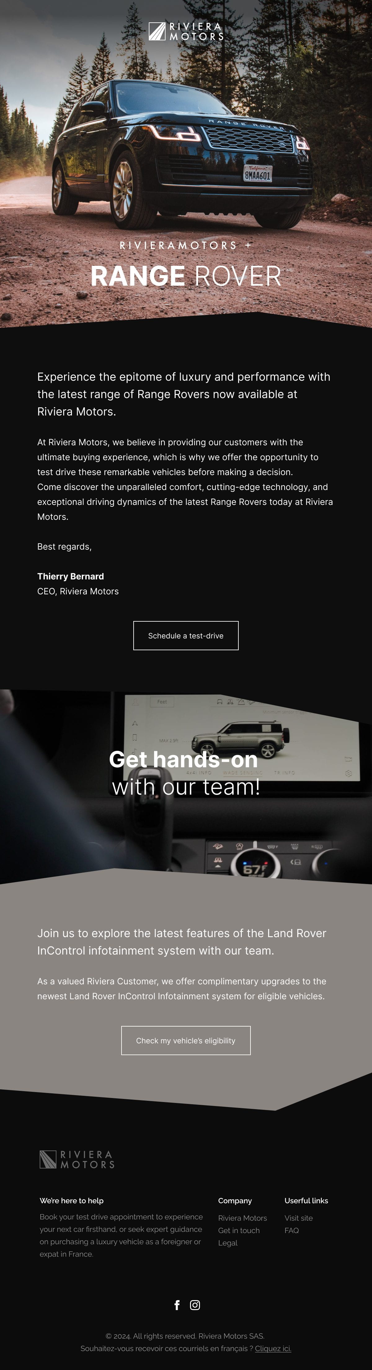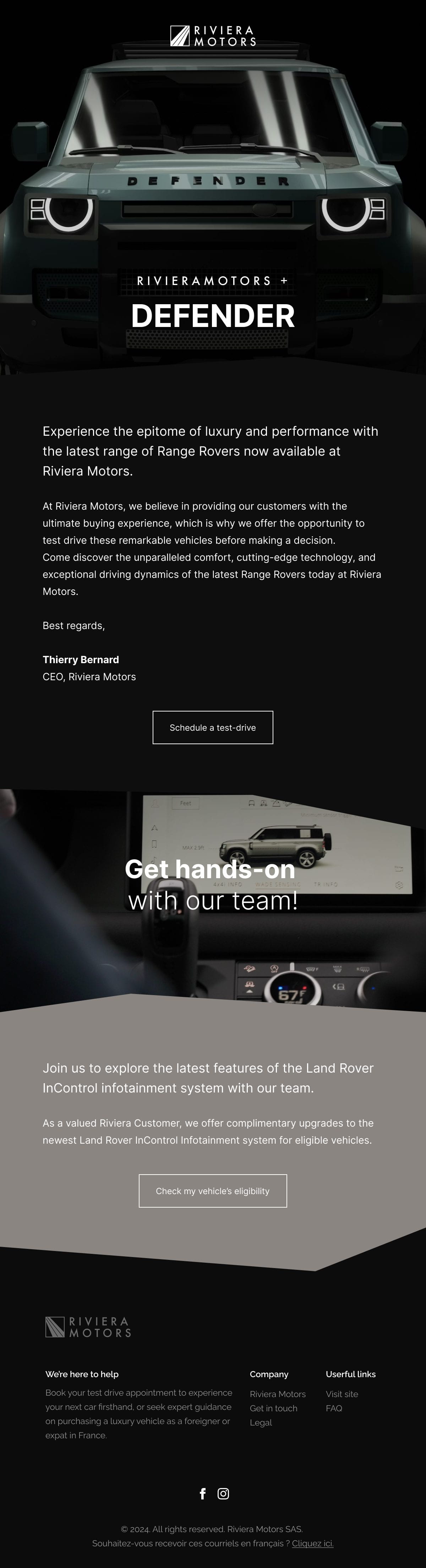 A full welcome sequence built to convert test drive leads into showroom visits. Designed for dark mode and Outlook, deployed in Klaviyo within 48 hours of lead capture.