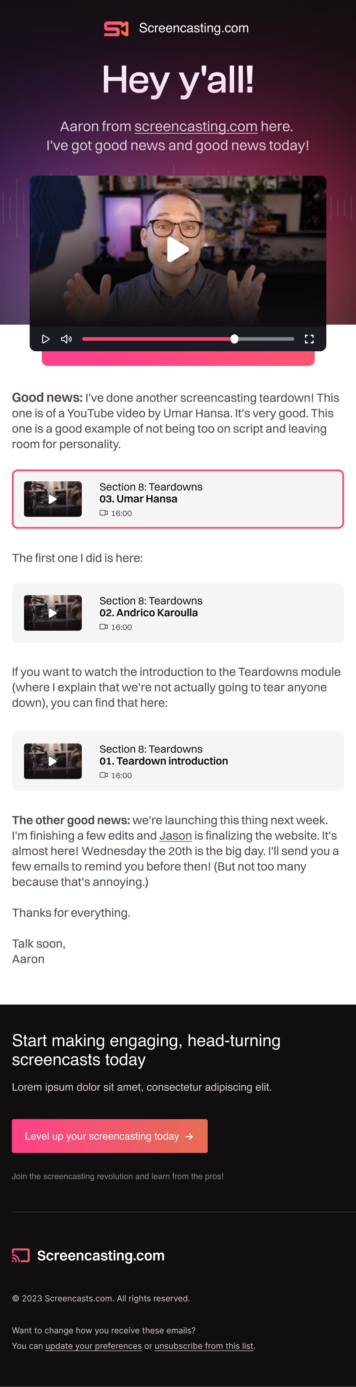 - Campaign archive review: subject lines, CTAs, design, structure