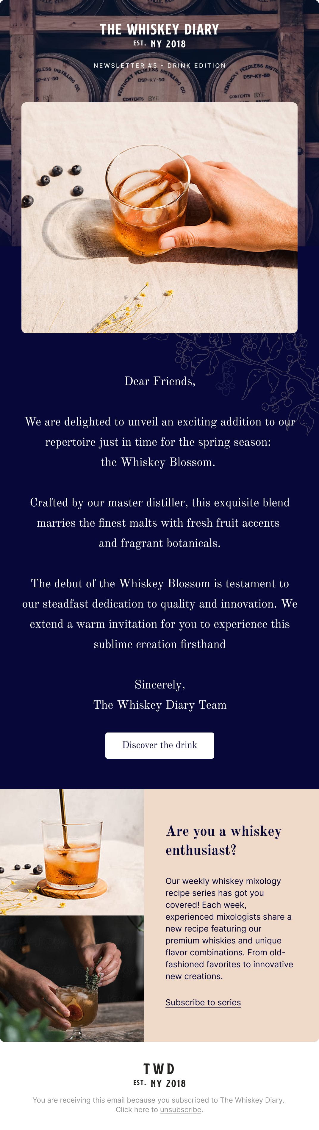 Six campaign templates built for a whiskey content brand running regular product partnerships. Documented for in-house use and built on a Maizzle design system.